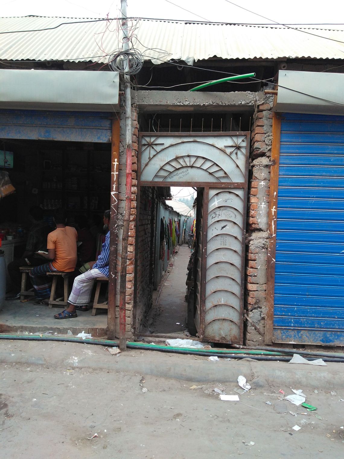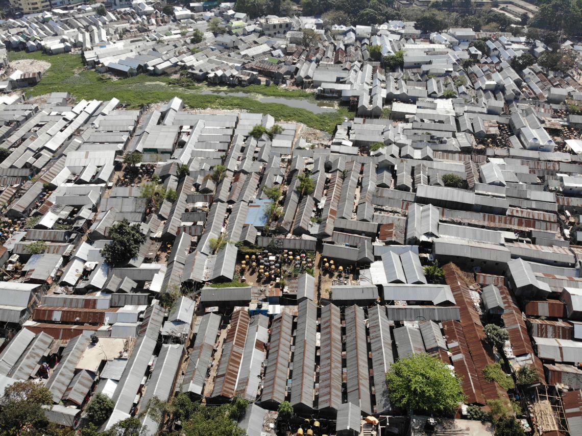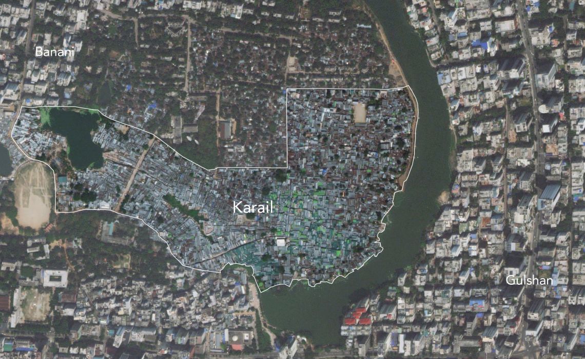 The neighborhood of Karail is located on a peninsula surrounded by Banani lake. The densely packed corrugated tin roofs of Karail stand in contrast to the commercial high rises and residences in Gulshan at the other side of the water body. Karail covers an area of approximately 100 acres and is home to approximately 300,000 residents. To approach Karail from the east, a boat or a raft is required. Whereas from the west, the first thing you come across is a wall running along the length of the settlement until it reaches the lake.