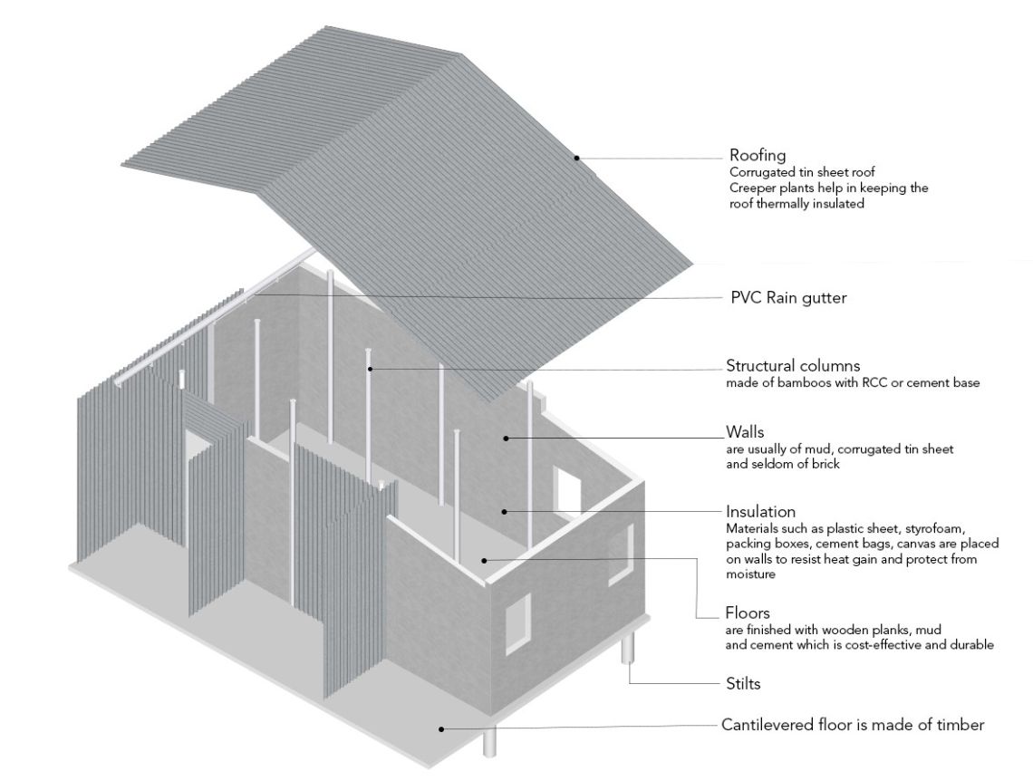 The housing units close to the water’s edge are mostly inhabited by migrants who move to Karail based on seasonal economic opportunities or new settlers who find housing through kinship ties or local village acquaintances. The houses are made on stilts and have a structural frame made of bamboo.