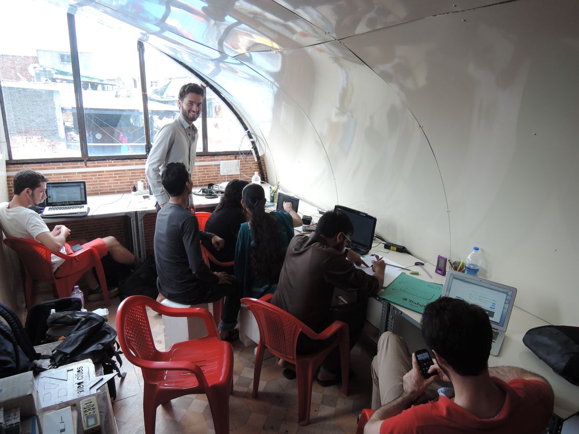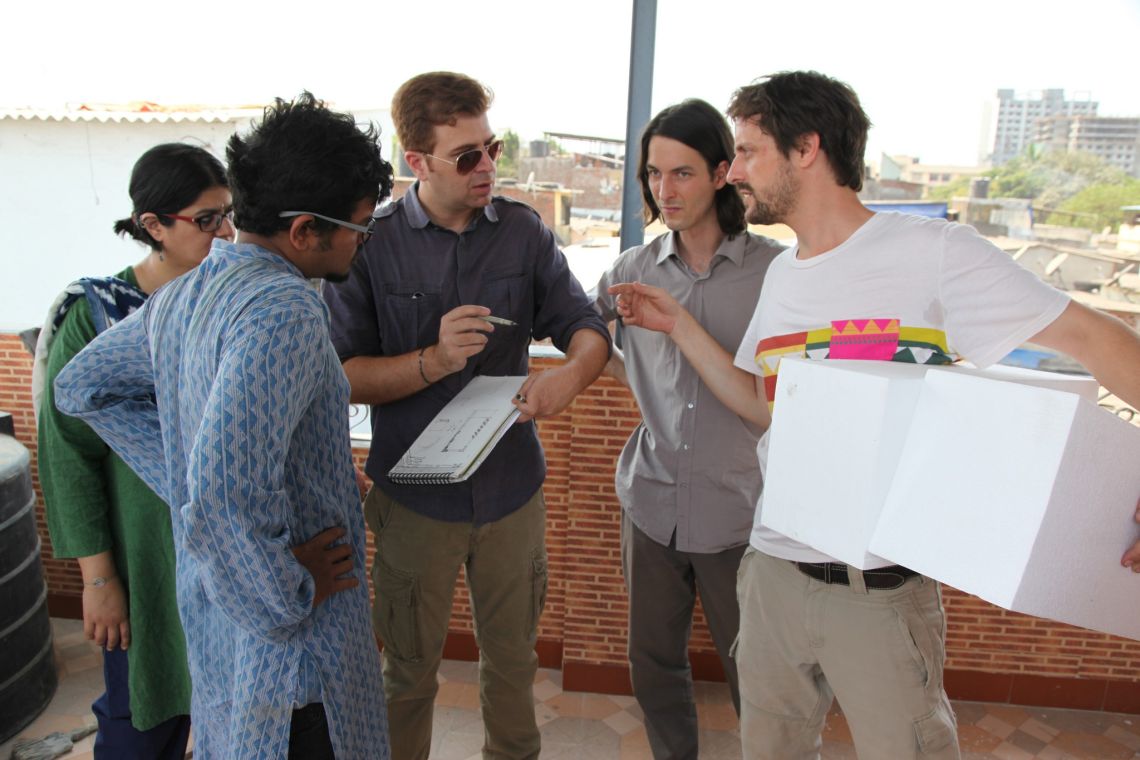 Whatever followed was really a spin-off of the several discussions with POP Lab, but had no connections with their own on-going experiments. The thing is – our local partner Pankaj Gupta, saw many possibilities for constructing our new office with it, which was encouraging. Technically it was a lightweight kuccha material so we could use it to build over an existing pucca structure. If designed appropriately, it could also be dismantled easily, thus broadly working within the legal guidelines.