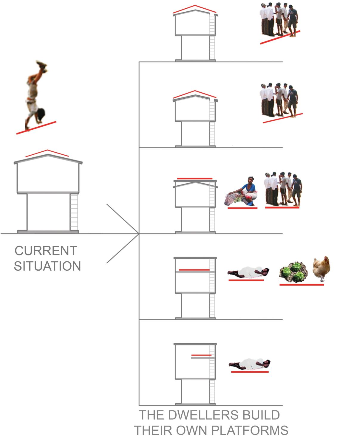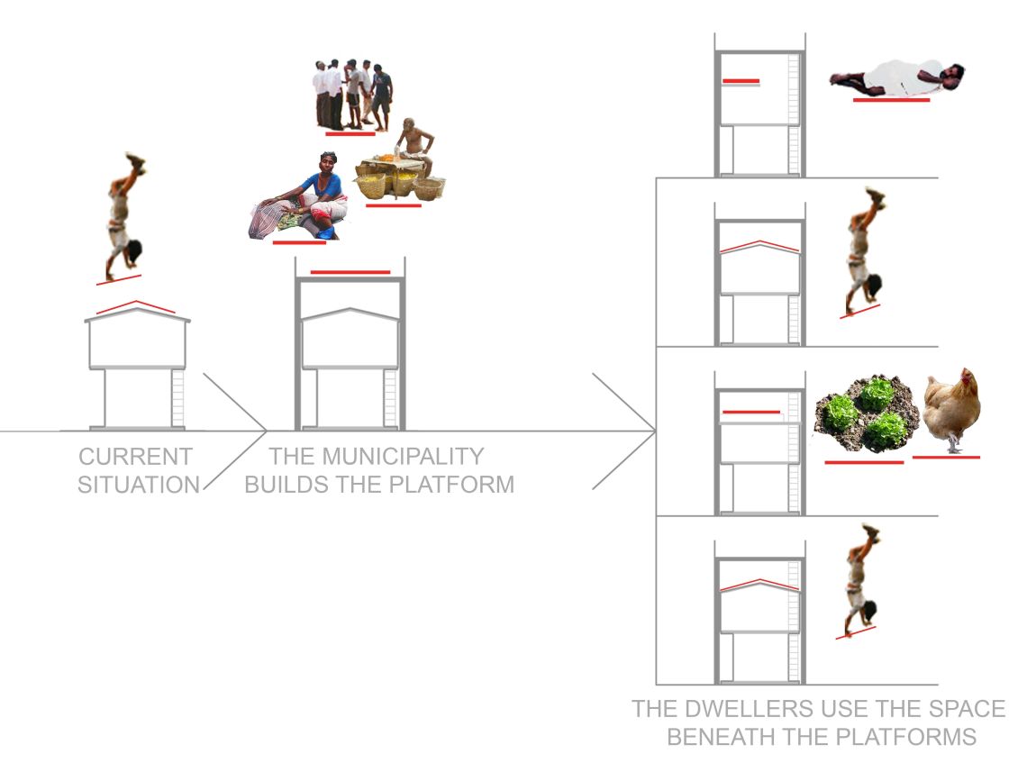 First of all, who is to build these platforms? The inhabitant? The Municipality? We decided to imagine involving both those actors, thinking of the process in the way that Urbz usually does: somebody thinks of something and starts it, then if it’s good and it works, it is most probable that others will follow his example and that “something” will spread out, more or less quickly. So, we thought, imagining a scenario in which the Municipality decides not to go through with the DRP, it would build the first platforms over a number of houses and then look as other dwellers build them for themselves, over their own houses.