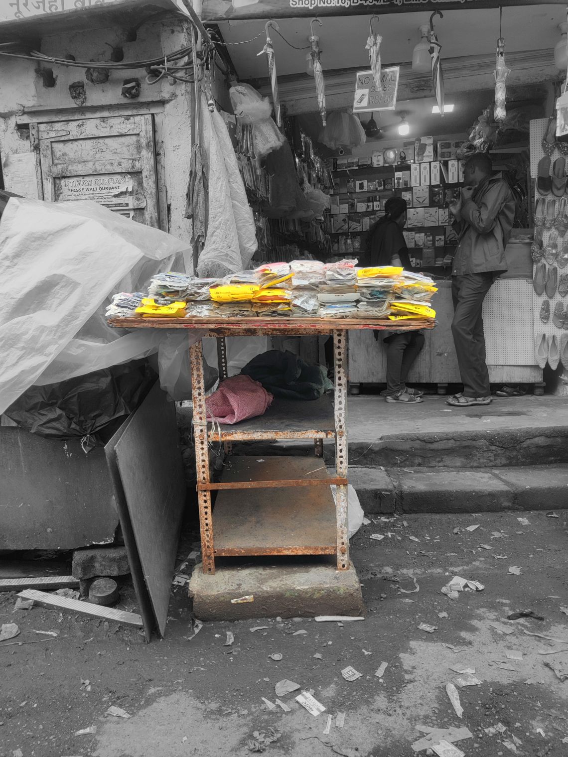 Conversations with these vendors revealed that to acquire the required spatial capital for the various economic activities, a whole economy of people and institutions is involved. For starters, the vendors are required to pay a daily unofficial tax, called hafta, created by corrupt practices to all those who exercise informal control over street space. These actors can include the landlords of the plot of land they set up their stores in front of, local politicians in charge of the specific stretch of land, Mumbai Police and BMC officials. The rates for each of these actors range between Rs. 10-20 each day, as has been reported anecdotally by the vendors themselves. The passing of the Street Vendors Act of 2014 recognises the legitimacy and legality of the activities of street vendors through a process of regularisation and licensing. This, along with the payment of the hafta would indicate the establishment of a right to the city exercisable by the vendors. Yet, access to these public spaces remains precarious. There is no guaranteed long-term access, with officials from the Mumbai Police or the Brihanmumbai Municipal Corporation making rounds to demand higher bribes, confiscating the goods being sold by the vendors, or quite often, both. There also exists a relation between the physical remnants left behind on the street at the end of each term by these structures which are dependent on the ownership and duration of occupancy of the space. This requires the structures set up by these vendors to take a material form which allows them to not only erect them quickly but also take them down just as fast. The quick response that the built structure exhibits towards its social and economic context along with its capacity to adapt to the climatic conditions is adhocratic in its very nature.