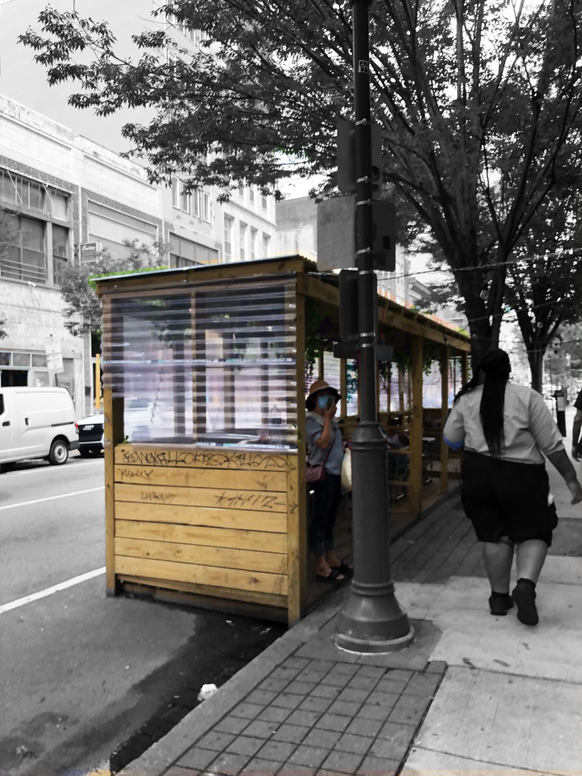In Philadelphia, the patio structures, which began as an emergency COVID-safety measure in the summer of 2020, are now being considered as potentially permanent fixtures of many cityscapes in the US. During the first summer of COVID lockdown in Philadelphia, the city began to issue emergency temporary licenses to restaurants allowing them to occupy public streets, sidewalks, and parking spaces to make room for restaurants to safely host diners. Customers, restaurants, and city-dwellers alike are enjoying what these structures bring to the city block, yet a number of contradictions arise from Philadelphia's eagerness to formally grant public space to restaurants for the production of private revenue. The introduction of the self-constructed patio draws focus toward the ways in which city government codifies legitimacy, which in turn shapes and restricts access to urban space.
