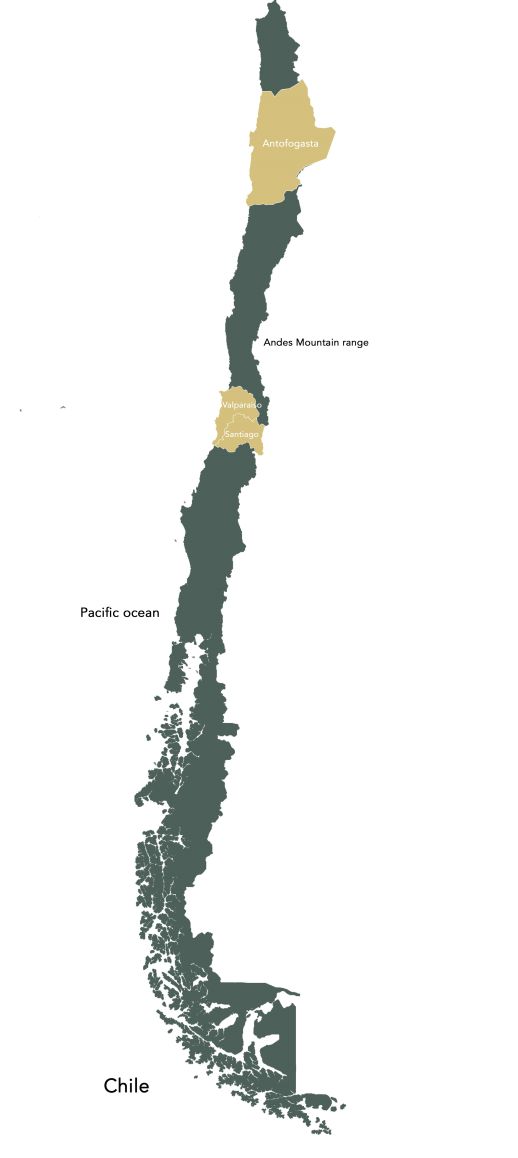 The varying topography and geological complexity in Chile contribute to the diverse formations of campamentos and the challenges faced by the residents in different locations. In Chile, the north is characterized by arid desert landscapes, shifting to the temperate Mediterranean climate in the central region, and finally the wet and chilly regions of the south. The eastern boundary of Chile is defined by the Andes mountain range. The west of Chile has lower coastal hills defined by steep slopes and ravines. Santiago and Valparaíso are both metropolitans in Central Chile. Valparaíso is an important coastal harbor city while Santiago is larger and is situated in a valley of fertile lands.