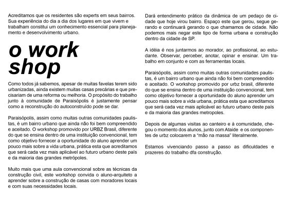 Paraisópolis, assim como muitas outras comunidades paulistas, é um bairro urbano que ainda não foi bem compreendido e aceitado. O workshop promovido por urbzbrasil, diferente do que se ensina dentro de uma instituição convencional, tem como objetivo fornecer a oportunidade do aluno aprender um pouco mais sobre a vida urbana, prática esta que acreditamos que será cada vez mais aplicável ao futuro urbano deste país e da maioria das grandes metropoles.