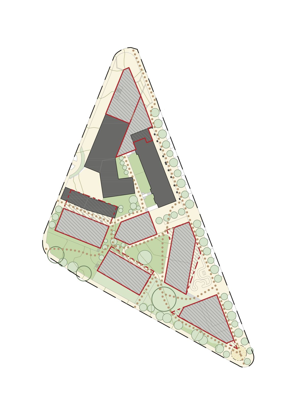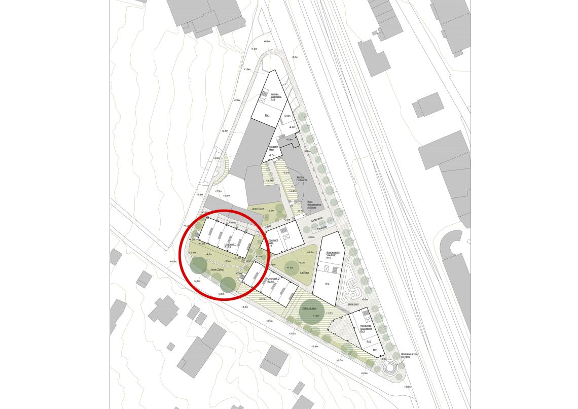 Nous avons commencé par considérer deux axes principaux – ouest-est et nord-sud . L’axe ouest-est traverse le site en suivant la pente du terrain. En haut le quartier de villa et le cimetière; en bas l’Avenue Lachenal et peut-être un jour une passerelle qui permettrait de franchir les rails directement depuis le site. La connexion nord-sud permet d’accéder au site depuis la gare ou depuis du côté de la route de Sauverny. Nous avons cherché à ouvrir le site le plus possible à ses environs – l’intention est bien d’offrir un nouveau « cœur de quartier » aux riverains qu’ils puissent utiliser et s’approprier. C’est donc un quartier conçu non seulement pour ses futurs habitants, mais aussi pour tous les usagers qui pourront y passer. Le fait que ce quartier soit mixte (par obligation) – intégrant aussi bien des logements que des activités  - est ainsi valorisé. C’est un quartier vivant et actif que nous imaginons.