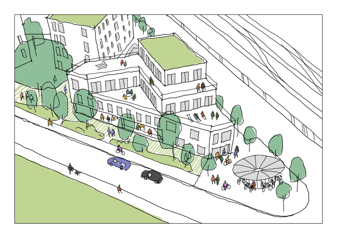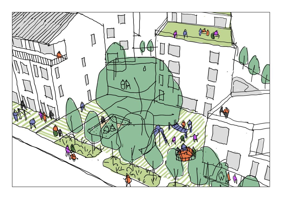 L’urbanité de proximité et de qualité que les habitants souhaitent voir sur le site doit être ouverte sur le reste du quartier, tout en créant des espaces intimes et conviviaux où il fait bon se retrouver entre voisins et où l’on peut aussi croiser des passants et des visiteurs. Plutôt qu’un grand espace impersonnel entre les immeubles nous avons donc cherché à créer des lieux pouvant développer des atmosphères distinctes et pouvant servir à différents publics – tout en leur permettant de se croiser.