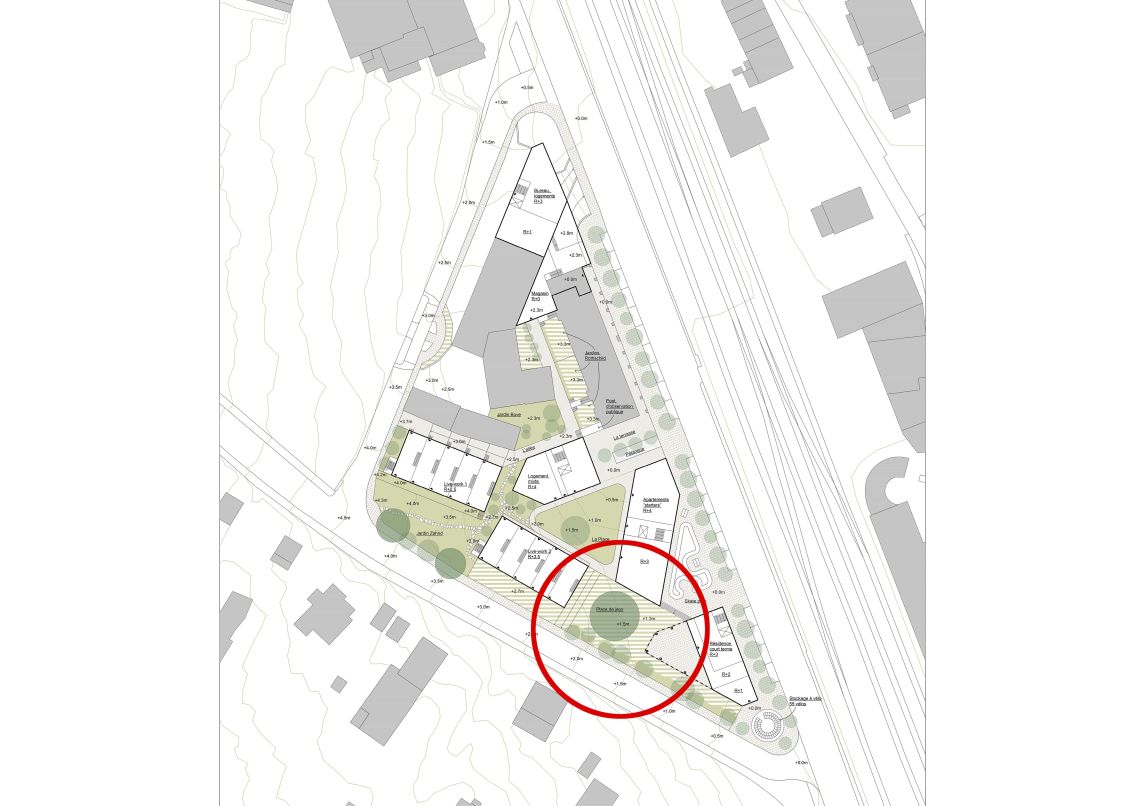 A la pointe ouest du site, nous imaginons un jardin qui offre à tous les riverains, descendant du bassin résidentiel, une entrée douce et verte à ce cœur de quartier. Ce jardin serait un lieu calme, respectueux du cimetière tout proche. Les deux grands sapins qui donnent déjà une identité solennelle à cette pointe du triangle seraient conservés et valorisés par la présence d’une végétation représentative de la flore locale. Nous imaginons que ce petit jardin intime pourrait être dédié aux bonnes relations de voisinage que M. Werner Zahnd qui habitait la maison du 6 chemin Dégallier incarnait auprès de tous ceux qui l’ont connu – et pourrait donc porter son nom. Ce jardin est aussi une hommage à la passion d’un grand nombre de Versoisiens pour le jardinage et la flore.