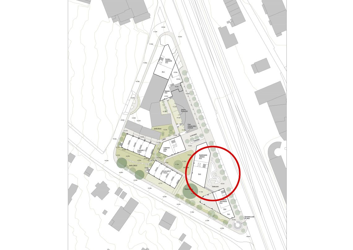 L’immeuble « Starters » monterait à R+4 coté rail et serait R+3 du coté donnant sur l’intérieur du site (donc une hauteur moyenne de R+3.5). L’immeuble triangulaire en bout de site que nous appelons « short-term » pourrait aussi monter un peu plus du côté des rails et redescendre du côté « quartier ». Cette configuration lui permettrait d’offrir des terrasses et une vue agréable à ses habitants. Une description plus détaillée des ces deux immeubles suit ci-dessous.