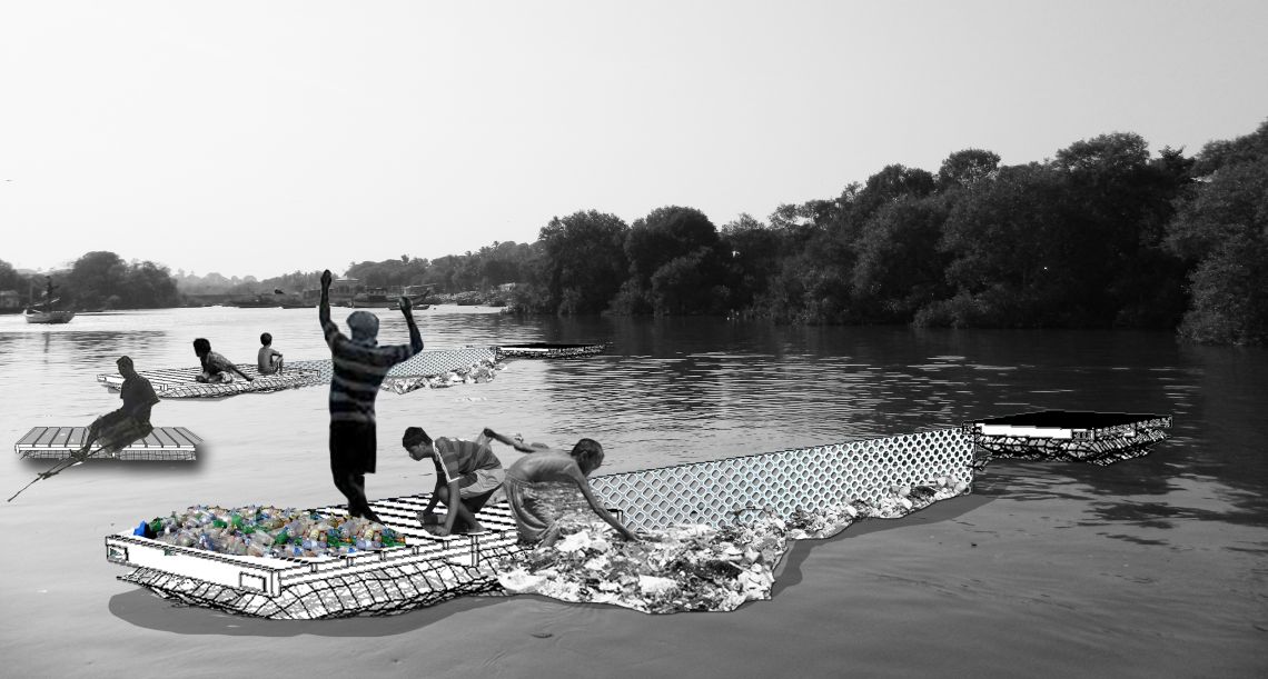 The first phase aims to inaugurate a ‘Knowledge Center’ with the support of the already established Versova Co-operative society. This center proposes to facilitate new activities and services based on the principle of micro-intervention. One of the major pollutants responsible for the coastal and mangrove degradation is plastic debris. The first step of this phase designates focal points for waste collection and segregation. The center would use the skills of the net weavers to make filter screens, suspended 2 meters deep in the creek and anchored along the edge, imitating a water filter system. This ensures uninterrupted movement of fish while creating an efficient method for waste collection. The plastic debris collected from a comprehensive waste sorting would be recycled and repurposed.