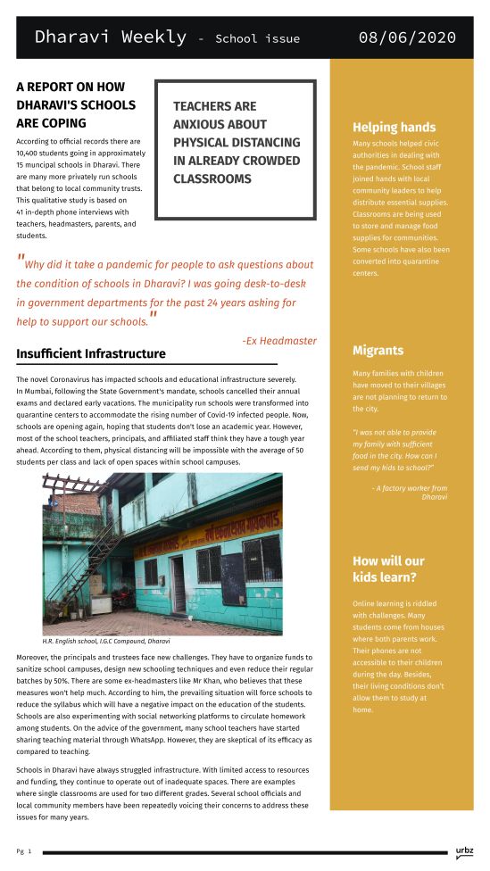 This is the fourth weekly report on how Dharavi's schools are coping. This qualitative study is based on 41 in-depth phone interviews with teachers, headmasters, parents, and students.