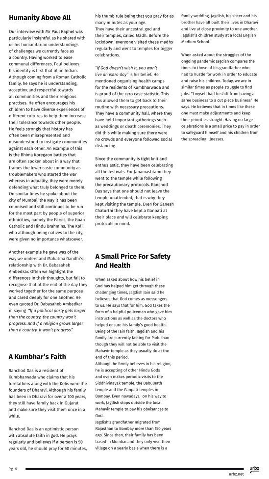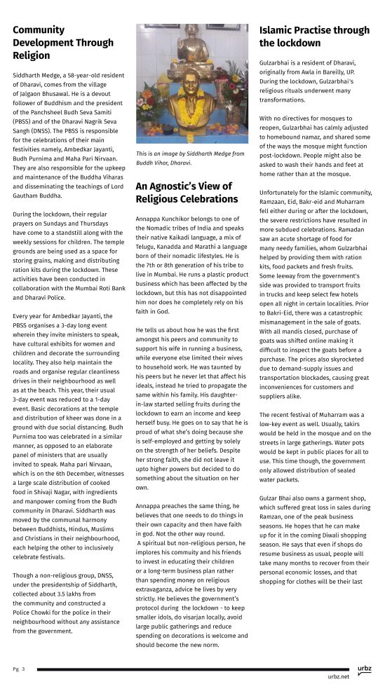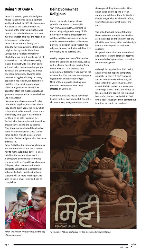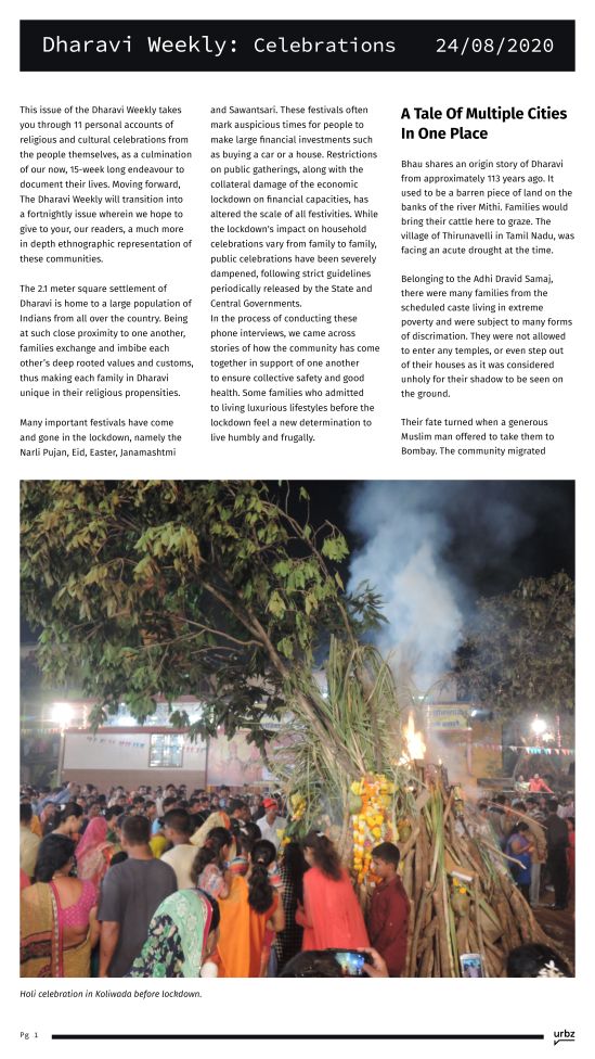 This issue of the Dharavi Weekly takes you through 11 personal accounts of religious and cultural celebrations from the people themselves, as a culmination of our now, 15-week long endeavour to document their lives. Moving forward, The Dharavi Weekly will transition into a fortnightly issue wherein we hope to give to you, our readers, a much more in depth ethnographic representation of these communities.