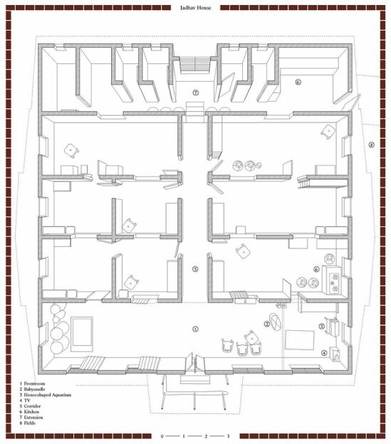 A newly built “chawl” type house built with a local stone called laterite, which is perfectly suited for the hot and humid climate of the Konkan region. The house, which is modeled on workers’ barracks typical of Mumbai, has rooms for 6 brothers and their families. Only one of the brother is permanently based in the village. Photo by Marius Helten for urbz.