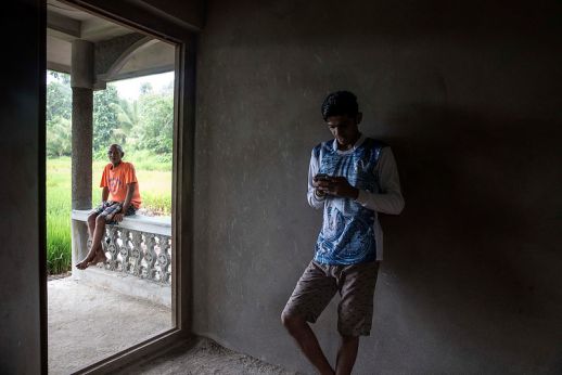 The Takle family’s new house in the village of Songiri. The aspirational urban house one cannot afford in the city is built back in the village. Akshay, on a short visit from Mumbai tests the mobile phone reception from the house. Just outside, we see Shantaram seated on the porch. He is the family’s patriarch who retired in the village after decades spent in Delhi and Mumbai.